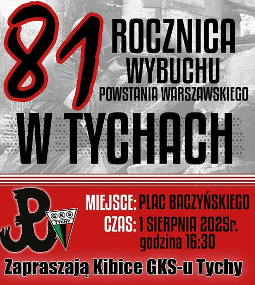 Naszą rolą, kibiców GKS Tychy jest pamiętać o powstańcach. Jak co roku zbierzemy się w dniu 01 sierpnia na Placu Baczyńskiego. Rozwiniemy największą w Polsce flagę, odśpiewamy hymn narodowy i rozpalimy pamięć o powstaniu. W tym roku przygotowaliśmy także drobną atrakcję – quiz wiedzy o Powstaniu Warszawskim. Nasze spotkanie ma charakter spontaniczny, nie ma tutaj wielu atrakcji. Ale w tym dniu warto być z nami. Zapraszamy!