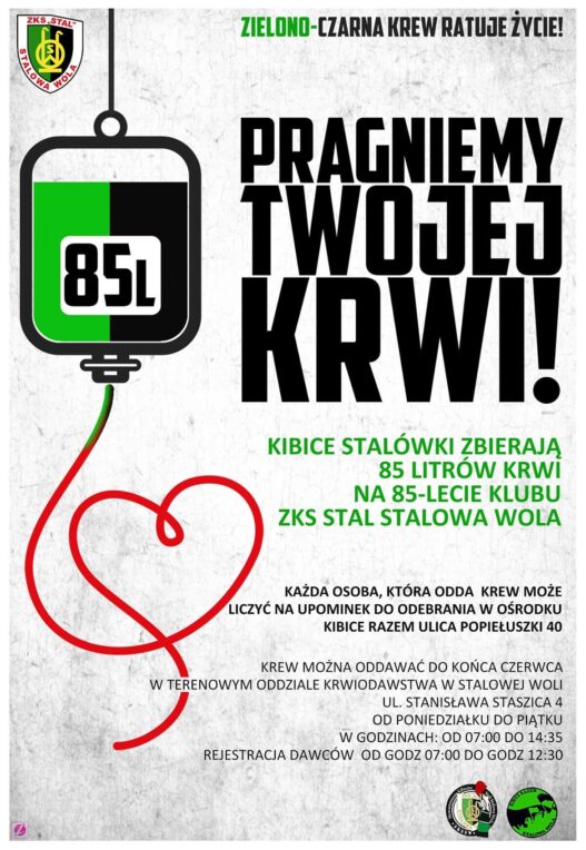Przypominamy, że z okazji 85-lecia Klubu Stal Stalowa Wola, Ośrodek Kibice Razem wraz ze Stowarzyszeniem Kibiców Stali Stalowa Wola zorganizowali zbiórkę krwi.
