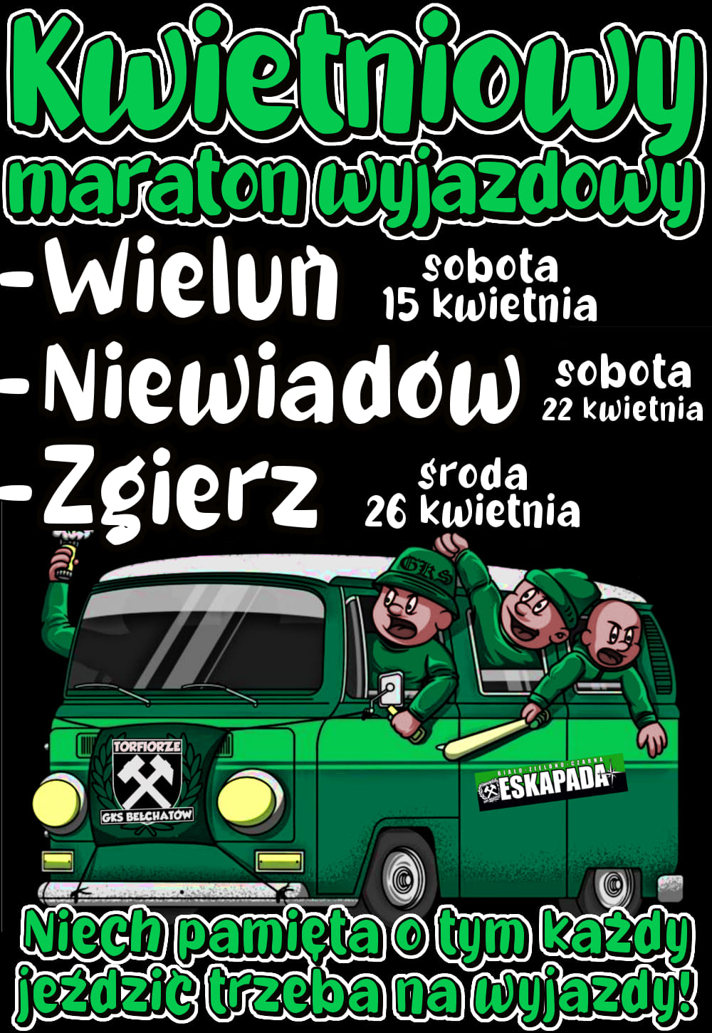 Pojedynki w delegacjach „Brunatni” rozpoczną 15 kwietnia w Wieluniu, 22 kwietnia zagrają w Niewiadowie a cztery dni później w podłódzkim Zgierzu. Na każdym z tych spotkań musi pojawić się liczna grupa wyjazdowiwczów!