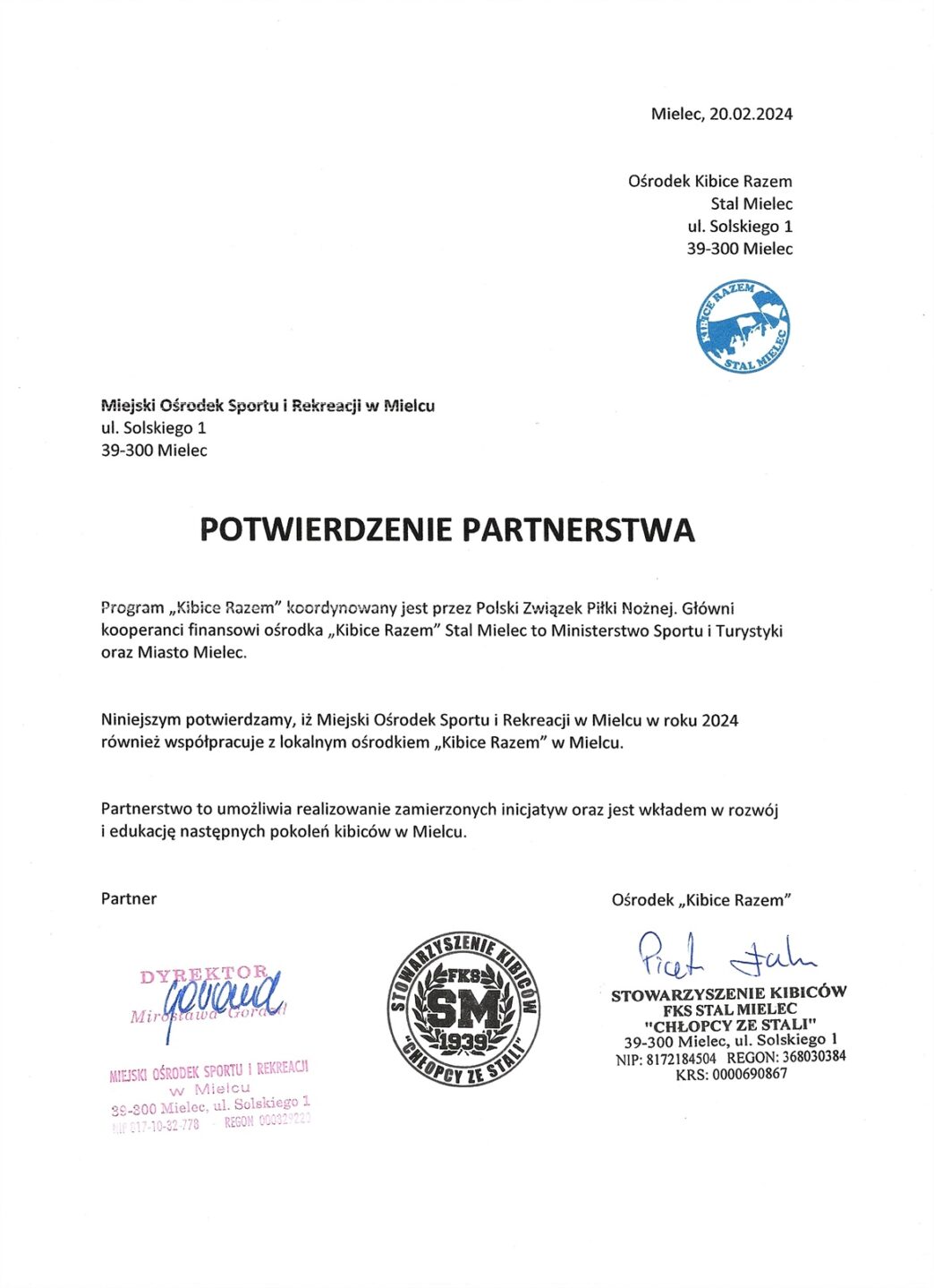Witamy MOSiR Mielec w zacnym gronie partnerów ośrodka Kibice Razem Stal Mielec w 2024 roku.https://kibice-razem.plProgram „Kibice Razem” koordynowany jest przez Polski Związek Piłki Nożnej. Główni kooperanci finansowi ośrodka „Kibice Razem” Stal Mielec to Ministerstwo Sportu i Turystyki i Turystyki oraz Miasto Mielec.