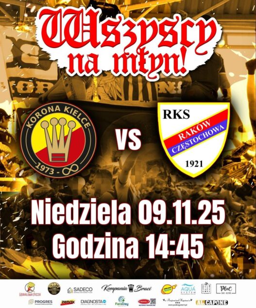 Mobilizacja na domowy młyn przed meczem z Rakowem Częstochowa. Kibice informują, że po serii meczów wyjazdowych nadchodzi czas na spotkanie na stadionie przy ulicy Ściegiennego w Kielcach. W nadchodzącą niedzielę o godzinie czternastej czterdzieści pięć kielecka Korona podejmie na własnym boisku drużynę Rakowa. Fani uważają, że obecność każdego sympatyka kieleckiego klubu w sektorze młyn jest tego dnia obowiązkowa. Bilety na to emocjonujące starcie są wciąż dostępne do nabycia w punkcie D3G-Fan Store – Sklep Kibica Korony Kielce. Sympatycy planują szczelnie wypełnić swój sektor i głośno wspierać zawodników przez pełne dziewięćdziesiąt minut spotkania. Każdy obecny w sercu dopingu jest odpowiedzialny za stworzenie niesamowitej atmosfery i motywowanie piłkarzy do walki o ligowe punkty. Kielecka ekipa chce pokazać swoją siłę na własnym terenie i ponieść drużynę do kolejnego zwycięstwa. Wspólny śpiew i machanie szalikami mają stworzyć żółto-czerwone morze na trybunach kieleckiego obiektu. Mobilizacja trwa na wszystkich osiedlach i w każdym kieleckim fan klubie przed tym ważnym meczem. Fani wierzą, że ich fanatyczne wsparcie będzie kluczowe dla sportowego sukcesu kieleckiej Korony. Wszyscy na młyn, aby wspólnie walczyć o dobre imię klubu i kolejne ligowe triumfy.
