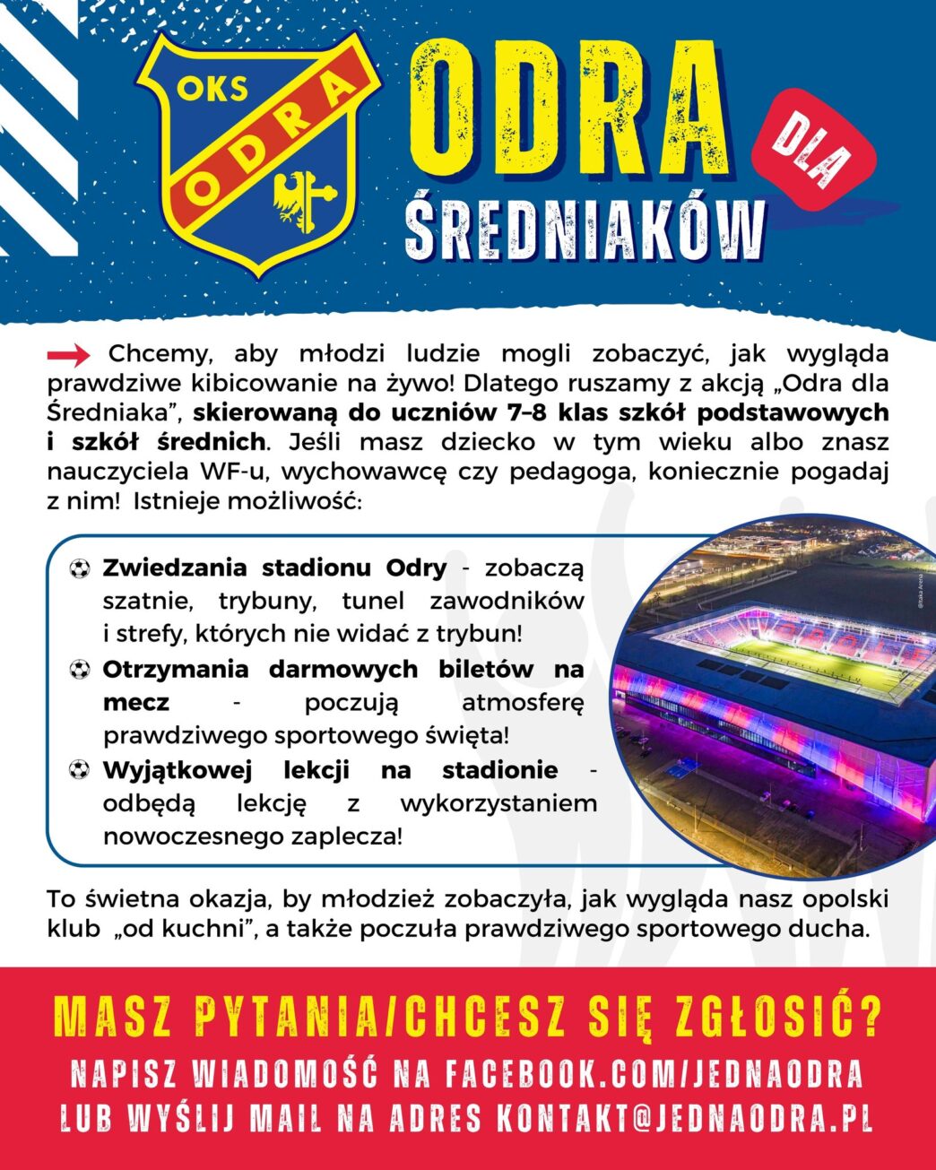 Dzięki współracy z OKS Odra Opole S.A. możemy zaprosić uczniów klas 7-8 szkoły podstawowej oraz szkół średnich na mecze Odry Opole! W tym roku chcętnych zapraszamy jeszcze na mecz z Chrobrym Głogów, który zaplanowany jest na 29 listopada.
