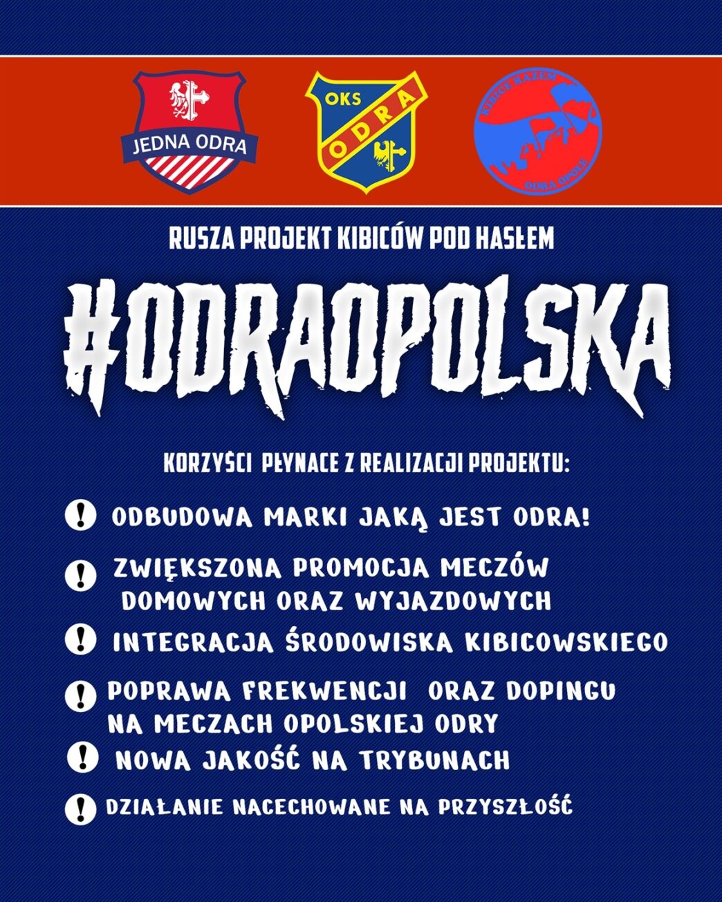Zmiana priorytetów, nowa energia, nowi ludzie, nowe pomysły – to w skrótcie baza na której opiera się projekt #OdraOpolska realizowany przez Stowarzyszenie Sympatyków Odry Opole „Jedna Odra”, ośrodek „Kibice Razem” w Opolu we współpracy z klubem i innymi partnerami.