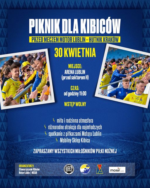 Mamy dla Was fantastyczną wiadomość. Już 30 kwietnia od godziny 11:00 przed meczem Motor LublinHutnik Kraków odbędzie się piknik, który organizujemy wspólnie z Kibice Razem Motor Lublin i MOSiR Inspiruje nas Sport.