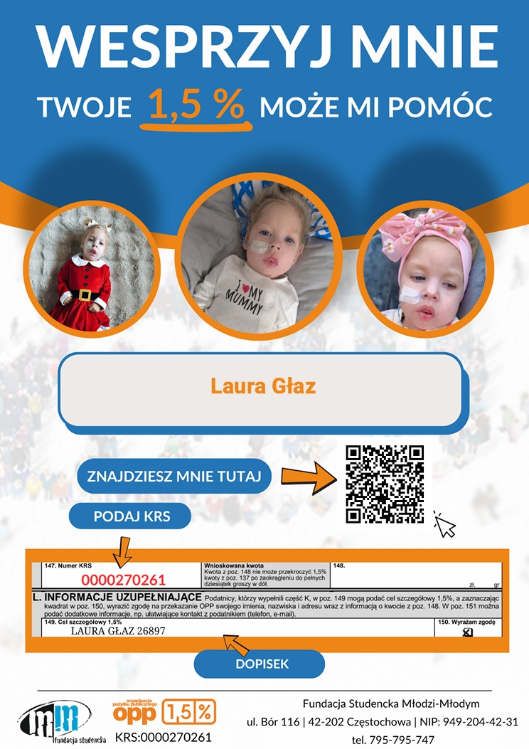 W imieniu rodziców Laury, jak i swoim gorąco zachęcamy do wsparcia oraz pomocy dla Laury. Z góry dziękujemy każdemu, kto zdecyduje się przekazać 1,5% podatku na ten cel.