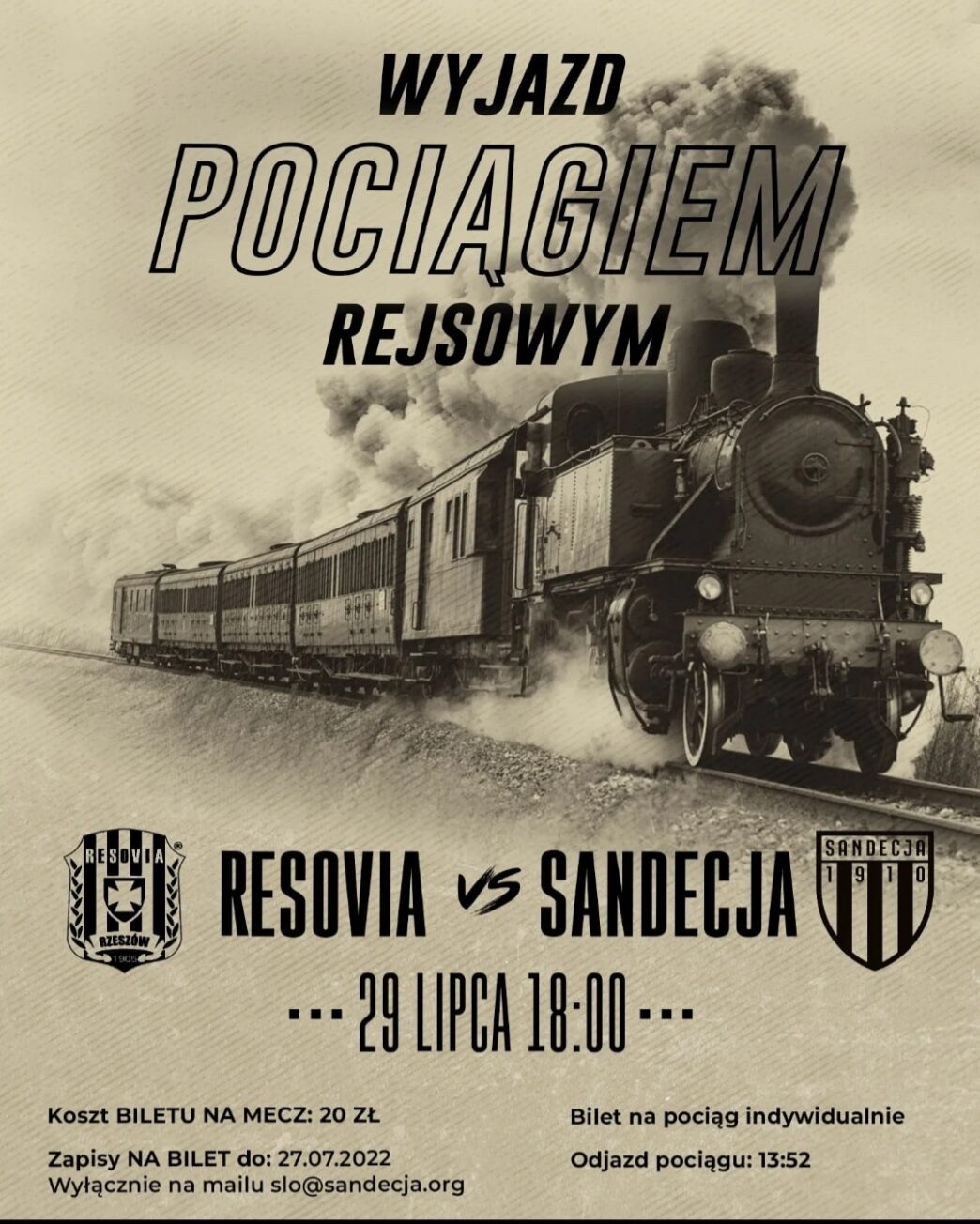 Wyjazd jakiego dawno u nas nie było. 29 lipca gramy spotkanie wyjazdowe w Rzeszowie. Zapraszamy wszystkich kibiców na ten mecz,  na który wybieramy się pociągiem.