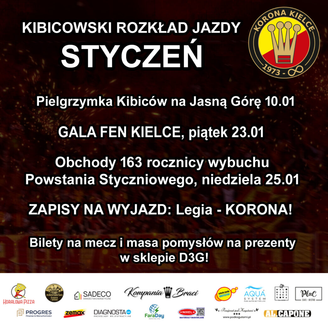 Kibice Korony ogłaszają kibicowski rozkład jazdy na cały styczeń i podkreślają, że działają intensywnie, a efekty tych prac będzie można zobaczyć niebawem. 10 stycznia rozpoczynają tradycyjną Pielgrzymkę Kibiców na Jasną Górę, która co roku gromadzi sympatyków z całego kraju. 23 stycznia na gali FEN w Kielcach przy ul. Bocznej swoje pojedynki stoczą Bartek Kowalczyk i Paweł Stefański z Miejskiego Klubu Sportów Walki Korona Kielce, co środowisko określa jako obowiązkową pozycję do odhaczenia. 25 stycznia na Białogonie zaplanowano Społeczne Obchody 163. rocznicy wybuchu Powstania Styczniowego, podczas których odbędzie się Msza Święta i przemarsz z pochodniami; wydarzenie współorganizują także Stowarzyszenie Kieleccy Patrioci oraz środowisko kibicowskie przy wsparciu Stowarzyszenia Kibiców Zjednoczona Korona i Ośrodka Kibice Razem Korona Kielce, co jest ważnym elementem kultywowania pamięci historycznej. Przez cały styczeń trwa mobilizacja i przygotowania do nowej rundy, a kibice podkreślają, że czekają ich świetne wyjazdy i kolejne okazje do zapisania się na kartach historii. W przestrzeniach kibicowskich zachęcają, aby rozmawiać, namawiać i mobilizować znajomych, ponieważ szykuje się wyjazd na Legię Warszawa, która po słabej jesieni będzie chciała się odbudować sportowo i kibicowsko. Wskazuje się, że wszystko zapowiada się ciekawie i że na stadionie może pojawić się komplet publiczności. Kibice zapowiadają, że lada chwila zostaną opublikowane szczegółowe informacje wyjazdowe, podbijając hasła mobilizacyjne i pewność siebie przed zbliżającą się rundą.