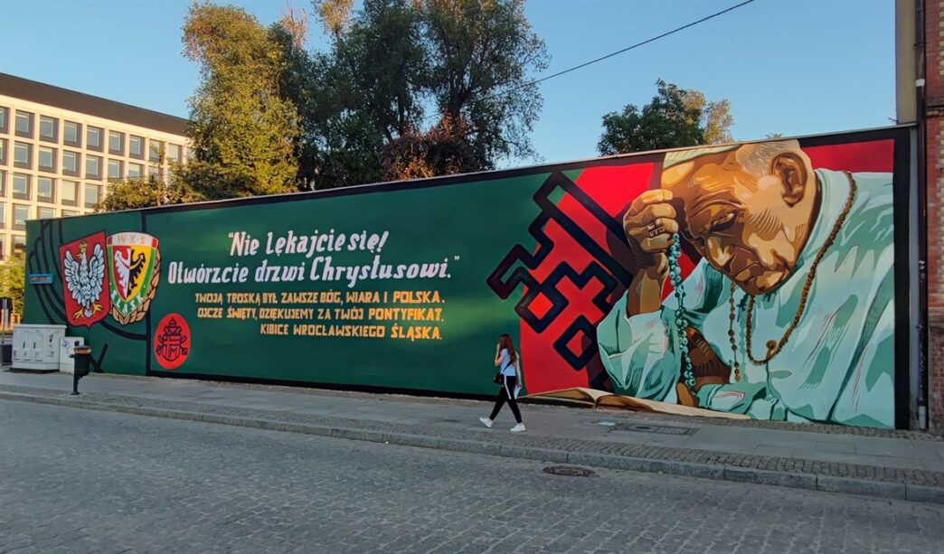 Mural o wymiarach 25 na 5 metrów z przesłaniem pontyfikatu św. Jana Pawła II został namalowany przez grupę Ultravaganza.