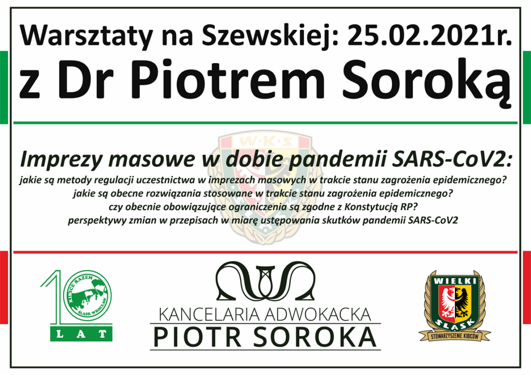 W najbliższy czwartek od godziny 16 przy ul. Szewskiej 66/67A w siedzibie ośrodka Kibice Razem i Stowarzyszenia Kibiców Wielki Śląsk odbędą się warsztaty prawne z dr Piotrkiem Soroką.