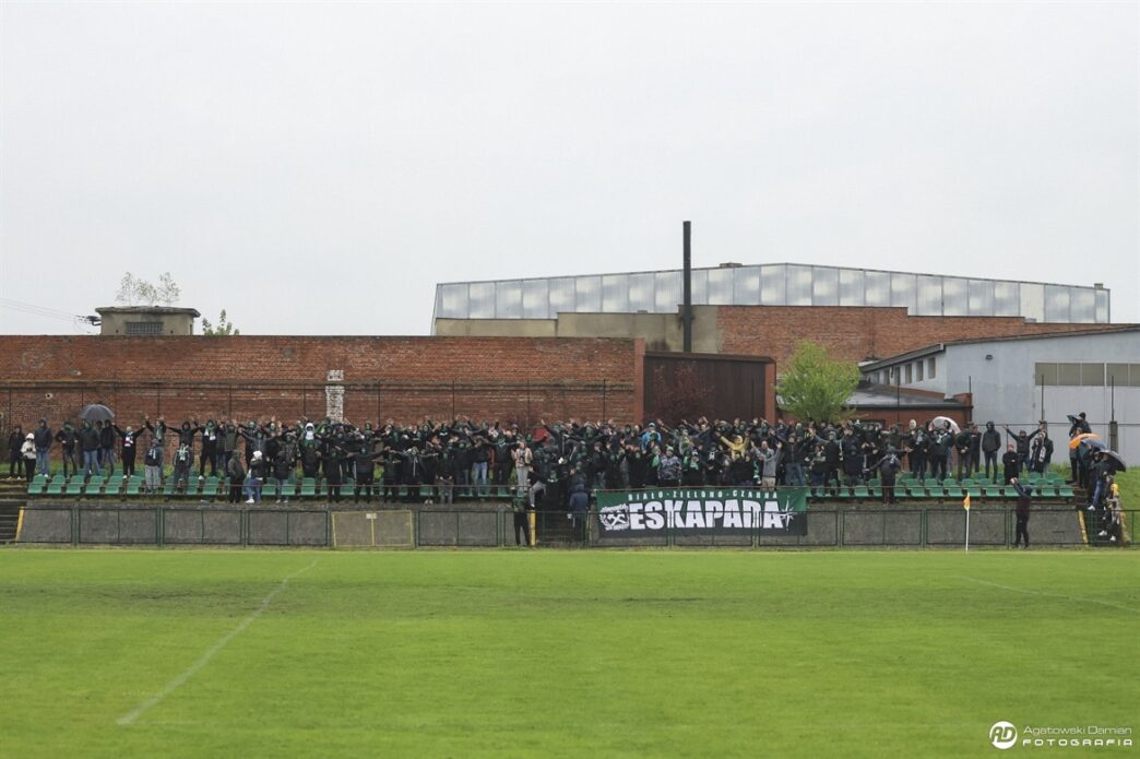 Promocja wyjazdu na niesprzyjającym nam teren przebiegła pomyślnie i w ok. 180 osób (3 autokary + auta) przyjechaliśmy, a następnie zajęliśmy miejsce na zelowskim stadionie. Wchodzimy za darmo, choć gospodarze próbowali zebrać od nas po 10 zł za bilety. Zdecydowana większość z nas wyposażona była w okazjonalne kominy.