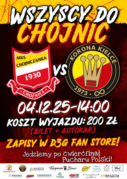 Wyjazdowa wyprawa kieleckich fanów do Chojnic w Pucharze Polski. Kibice przygotowują się na pucharową wyprawę do Chojnic, gdzie stawką będzie awans kieleckiej Korony do ćwierćfinału rozgrywek Pucharu Polski. Zapisy na ten wyjazd są prowadzone w punkcie D3G-Fan Store – Sklep Kibica Korony Kielce w standardowych godzinach otwarcia sklepu. Do drugiego grudnia obowiązuje promocyjna cena za bilet i transport w kwocie dwustu złotych dla każdego sympatyka kieleckiego klubu. Po tym terminie koszt udziału w wyprawie wzrośnie o pięćdziesiąt złotych, dlatego fani radzą nie zwlekać z zapisami. Organizatorzy podkreślają, że obowiązuje wyłącznie wspólny transport autokarowy dla całej kieleckiej grupy wyjazdowej bez żadnych wyjątków. Podczas meczu domowego z Cracovią będzie również możliwość zapisania się na wyjazd w namiocie Stowarzyszenia Kibiców Zjednoczona Korona. Fani planują spędzić ten cały dzień w kieleckim gronie, wspierając swoją drużynę od rana aż do wieczornego powrotu. Kielecka ekipa chce licznie stawić się w sektorze gości w Chojnicach i głośno dopingować zawodników w walce o pucharowe marzenia. Każdy wyjazd to nowa karta w historii kieleckiego ruchu kibicowskiego i okazja do integracji całej społeczności. Mobilizacja trwa na wszystkich osiedlach, aby żółto-czerwone barwy były godnie reprezentowane na północy kraju. Wszyscy fani wspólnie jadą po awans i po kolejne sportowe sukcesy swojego klubu.