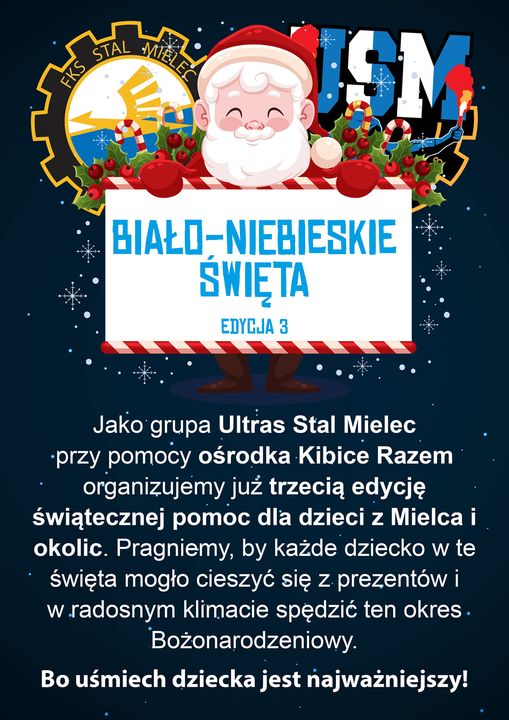 Grupa ULTRAS STAL MIELEC oraz ośrodek Kibice Razem Stal Mielec, po raz trzeci organizują świąteczną pomoc dla dzieci z Mielca i okolic. Pragniemy, by każde dziecko w te święta mogło cieszyć się z prezentów i w radosnym klimacie spędzić ten okres Bożonarodzeniowy.