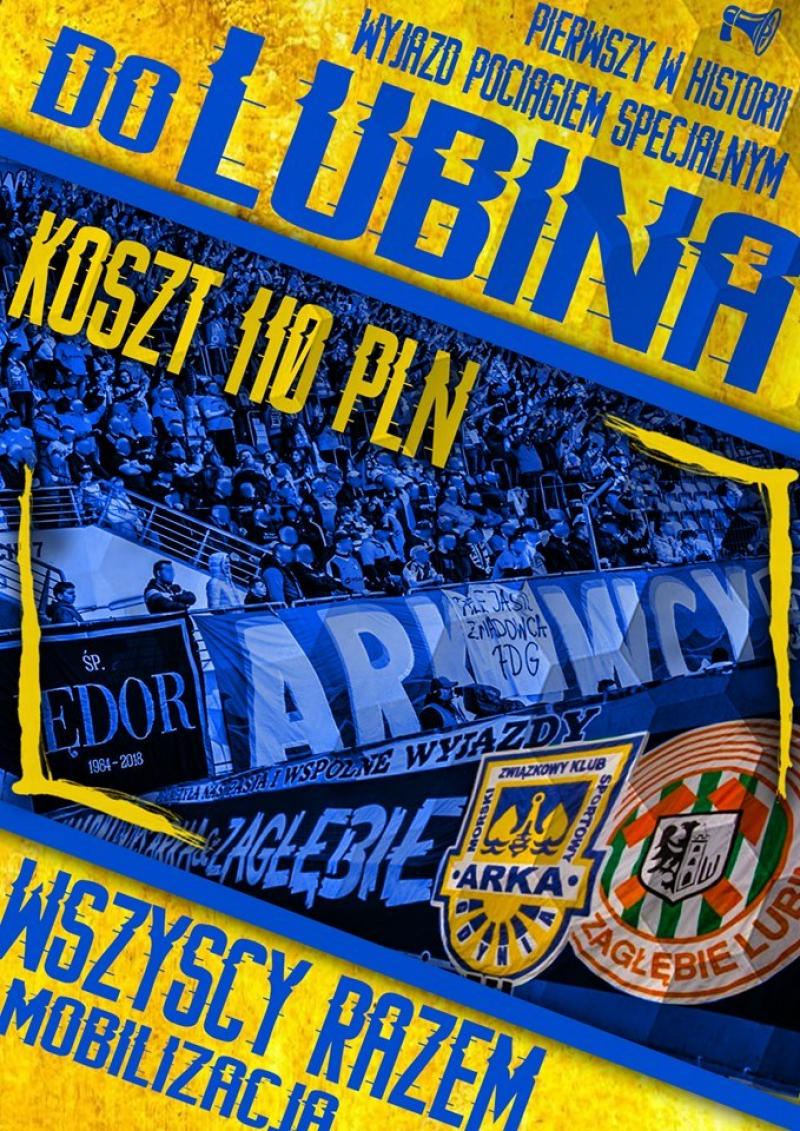 W sobotę 10 sierpnia o 17:30 Arka w ramach 4. kolejki Ekstraklasy rozegra mecz wyjazdowy z Zagłębiem w Lubinie. Miło nam poinformować, że po raz pierwszy w historii w delegację do naszych braci udamy się pociągiem specjalnym!
