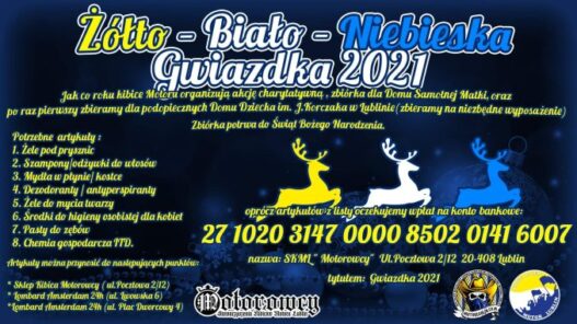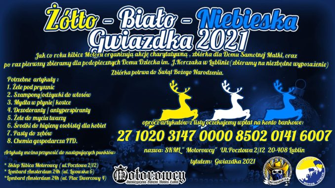 To już nasza piętnasta Żółto-Biało-Niebieska Gwiazdka. Postanowiliśmy więc ją w tym jubileuszowym roku trochę powiększyć. W zeszłym roku musieliśmy zrezygnować ze zbiórki rzeczowej, w związku z obostrzeniami, teraz jednak wracamy również do zbierania najpotrzebniejszych produktów. Dla Domu Samotnej Matki jest to głównie chemia kosmetyczna i gospodarcza oraz drobne AGD. Dom Dziecka najbardziej potrzebuje wsparcia w zakupie mebli dla swoich podopiecznych.