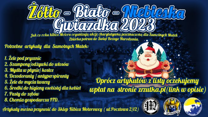 „Żółto – Biało – Niebieska Gwiazdka 2023”Jak zwykle o tej porze roku rozpoczynamy naszą świąteczną akcję. W tym roku nasza zbiórka osiągnęła pełnoletność ponieważ już po raz 18 zbieramy dary dla Domu Samotnej Matki na ulicy Chmielewskiego w Lublinie a także jak od niedawna dla Domu Dziecka im. J. Korczaka na ulicy Sierocej oraz Placówki Opiekuńczej „Pogodny Dom” z ulicy Pogodnej! Już nie raz udowodniliśmy, że nie ma rekordów, których nie da się pobić a Motor United to nie tylko puste…