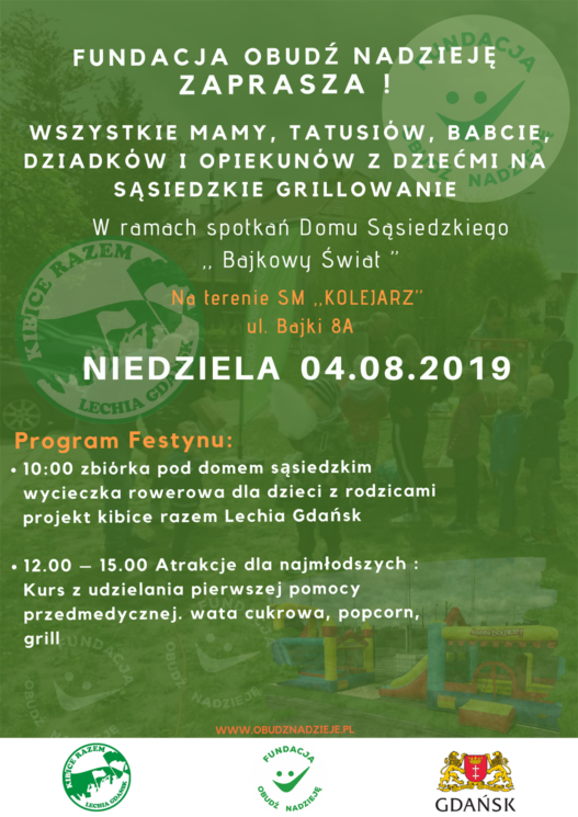Wspólnie z Fundacją Obudź Nadzieję zapraszamy w najbliższą niedzielę na Festyn sąsiedzki, który odbędzie się na Przeróbce na terenie SM „Kolejarz” ul. Bajki 8A. W ramach spotkania najpierw ruszymy z wycieczką rowerową po Żuławach, a następnie od godziny 12 wystartujemy z resztą atrakcji – grill, wata cukrowa, popcorn, kurs pierwszej pomocy. Serdecznie zapraszamy całe rodziny z dziećmi. Impreza organizowana jest w ramach spotkań Domu Sąsiedzkiego „Bajkowy Świat”.