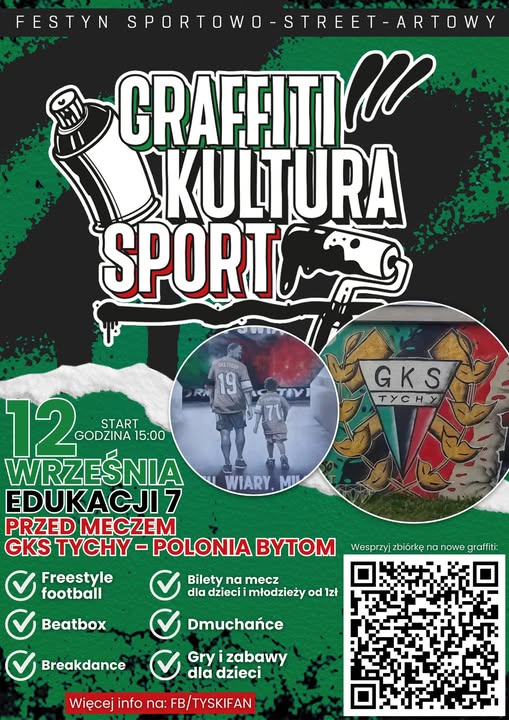 12 września, w dniu meczu z Polonią Bytom, nasze miasto ponownie stanie się gospodarzem wyjątkowego wydarzenia – Graffiti Kultura Sport. To największa impreza zorganizowana przez kibiców w tym roku, impreza która łączy sztukę, sport i kibicowską pasję. Spotykamy się przy Świątyni Futbolu na ul. Edukacji 7 czyli przy naszym stadionie