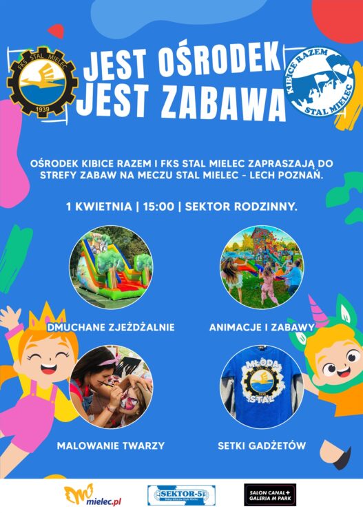 Ośrodek Kibice Razem Stal Mielec i PGE FKS Stal Mielec zapraszają do strefy zabaw na meczu Stal Mielec – Lech Poznań.1 kwietnia, sektor rodzinny, od godziny 15:00.PRZYGOTOWALIŚMY:- darmowe, dmuchane zjeżdżalnie- animacje i zabawy- malowanie twarzy- setki gadżetówPartnerzy:Sektor-5Salon Canal+ Mielechttps://kibice-razem.plProgram „Kibice Razem” koordynowany jest przez Polski Związek Piłki Nożnej. Główni kooperanci finansowi ośrodka „Kibice Razem” Stal Mielec to Ministerstwo Sportu i Turystyki…