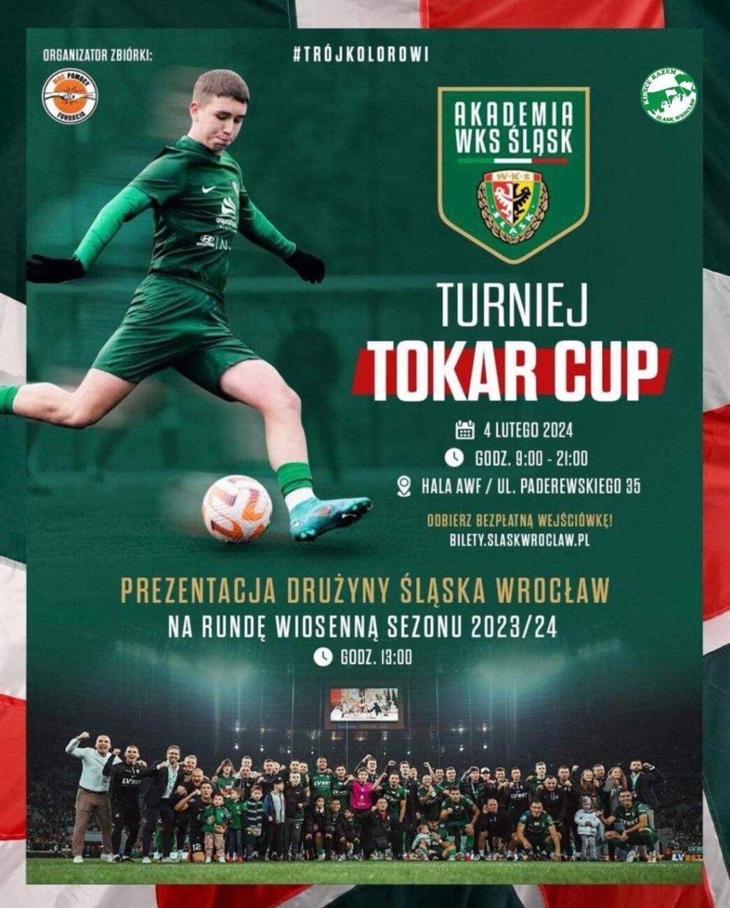 Jutro (4 lutego), w hali AWF we Wrocławiu odbędzie się charytatywny turniej, na którym będą zbierane pieniądze dla utalentowanego zawodnika Akademii Śląska Wrocław – Franciszka Tokarskiego. Młody piłkarz uległ poważnemu wypadkowi i walczy o powrót do zdrowia.Podczas imprezy odbędzie się prezentacja drużyny Śląska Wrocław na rundę wiosenną PKO BP Ekstraklasy 2023/24🇮🇹Informacje o wydarzeniu i możliwości zdobycia darmowych voucherów👉 bit.ly/TokarCupPrezentacjaRazem dla Franka!🤝🇮🇹