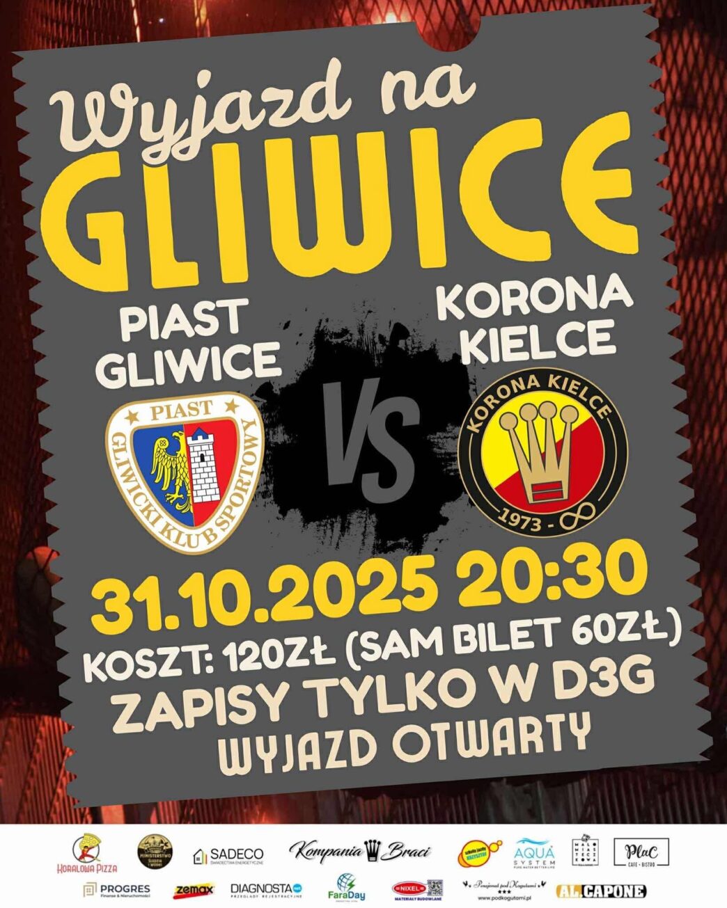Całkowity koszt obejmujący transport oraz bilet na mecz wynosi dla zainteresowanych jedynie 120 złotych.