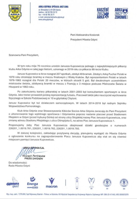 Chcielibyśmy Was poinformować, że wspólnie z naszym klubem złożyliśmy pismo z prośbą o nadanie placowi przed Stadionem Miejskim nazwy Placu Janusza Kupcewicza.