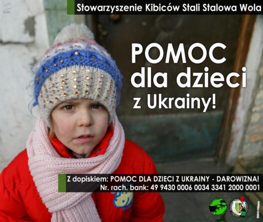 Stowarzyszenie Kibiców Stali Stalowa Wola informuje że od jutra 08.03.2022r. Będzie prowadzić zbiórkę środków pieniężnych na zakup najpotrzebniejszych artykułów higieniczno- sanitarnych na rzecz dzieci z Ukrainy które chwilowo przebywają w różnych ośrodkach w Stalowej Woli.