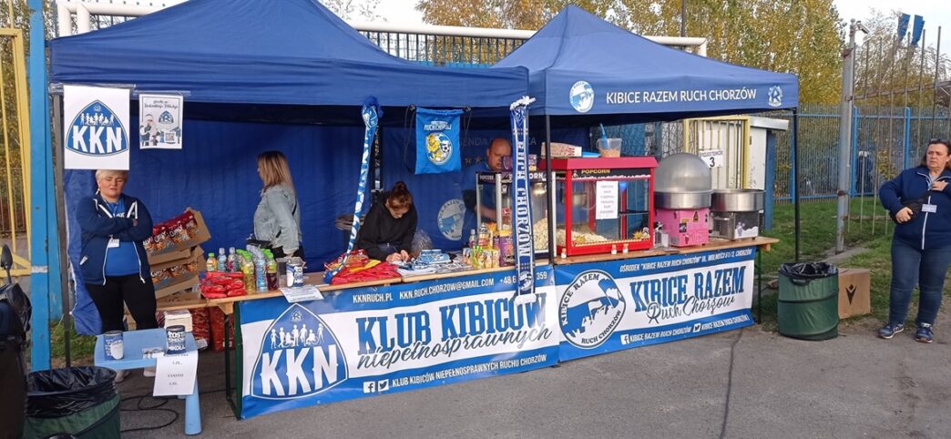 Niebiescy wygrali najważniejsze spotkanie w tej rundzie DeRbowe z rywalem z Katowic :. Podczas meczu zadebiutowały na naszym stoisku dwa banery reklamowe, które zaprojektował Incognito – Graphic Designer jeden informacyjny z Klub Kibiców Niepełnosprawnych Ruchu Chorzów oraz nasz które przy ozdobiły nasze stanowiska jak widać na poniższych zdjęciach