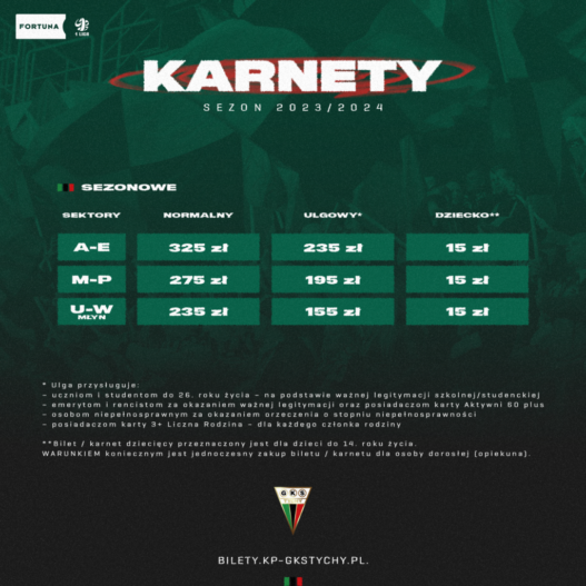 W środę (28 czerwca) o godzinie 17:00 rozpocznie się sprzedaż internetowa karnetów na sezon 2023/2024 Fortuna 1 Ligi. W pierwszej fazie nabyć będzie można wejściówki obejmujące wszystkie mecze ligowe przy Edukacji 7 nadchodzących rozgrywek.