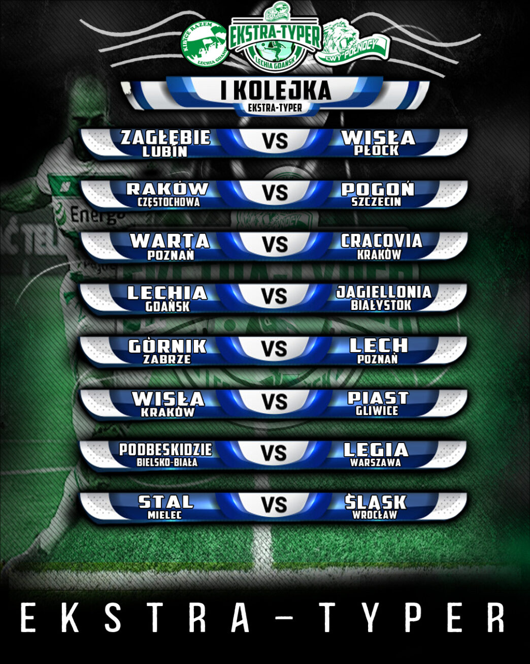 Startujemy z EKSTRA-TYPEREM, a tak prezentuje się zestaw par pierwszej kolejki. Cała zabawa odbywa się na naszym profilu na FB – KIBICE RAZEM LECHIA GDAŃSK.