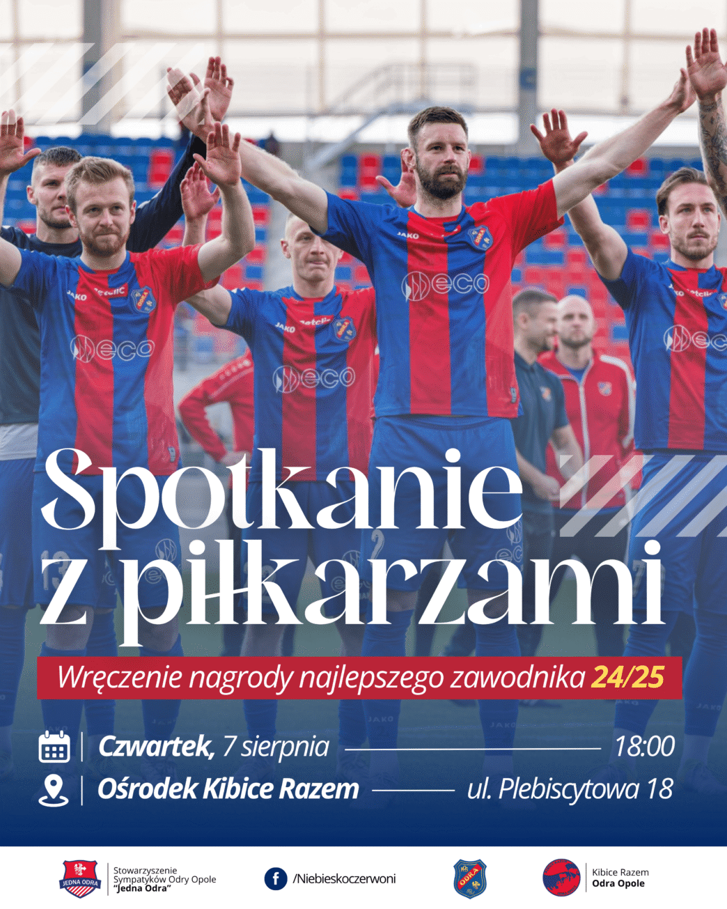 W najbliższy czwartek , w opolskim ośrodku „Kibice Razem”, o godzinie 18:00, odbędzie się spotkanie z piłkarzami i trenerem Odry Opole. W spotkaniu wezmą udział zawodnicy, którzy zajęli czołowe miejsca w plebiscycie na najlepszego zawodnika sezonu 2024/25.
