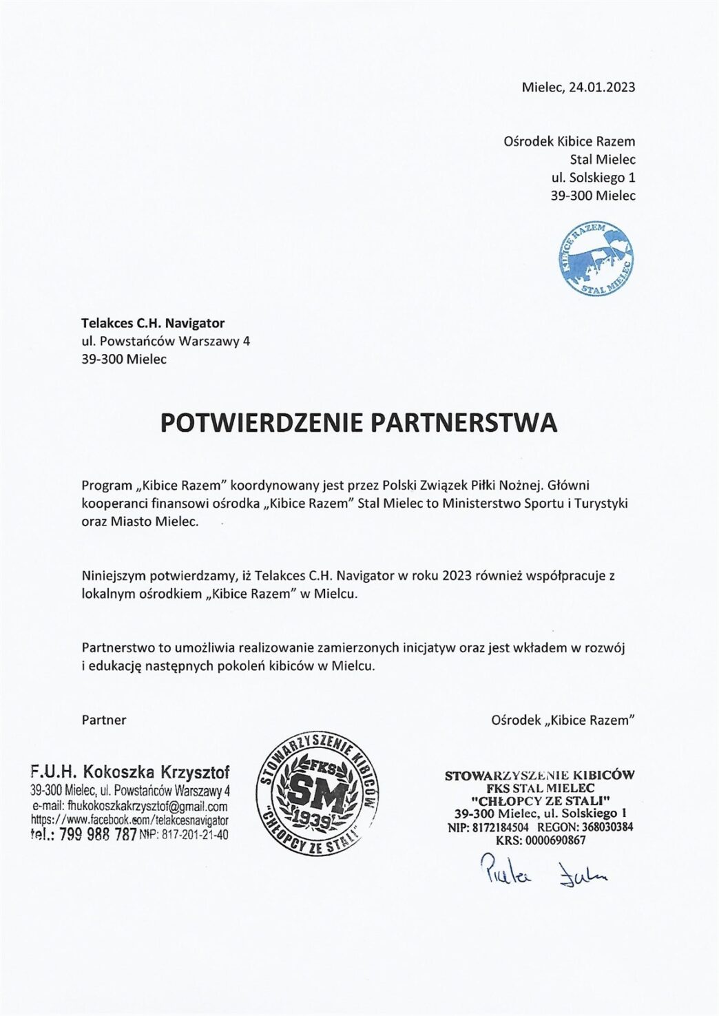 Niniejszym potwierdzamy, iż Telakces C.H. Navigator w roku 2023 również współpracuje z lokalnym ośrodkiem „Kibice Razem” w Mielcu.
