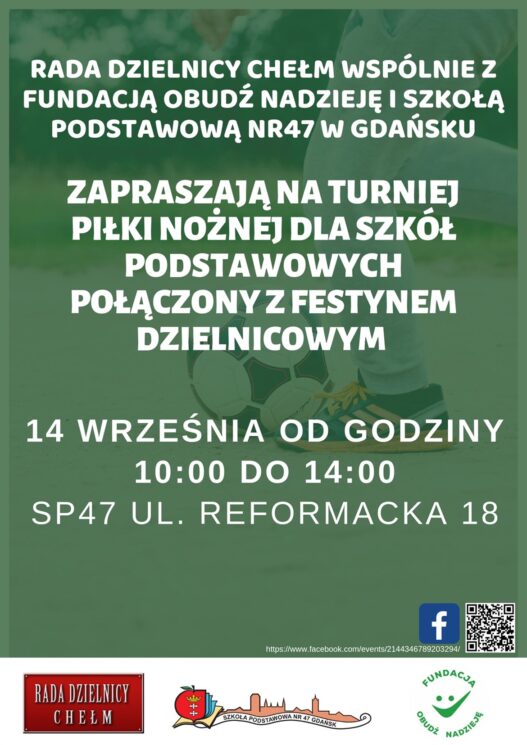 W najbliższą sobotę (14.09.2019) od godziny 10:00 zapraszamy na turniej piłki nożnej dla uczniów szkół podstawowych organizowany przez Fundację Obudź Nadzieję wspólnie z Radą Dzielnicy Chełm oraz Szkoła Podstawową Nr 47, na boiskach której odbędą się zawody (Chełm, ul. Reformacka 18). Oprócz boiskowych emocji wspólnie z Fundacją zapewniamy darmowe dmuchańce dla najmłodszych, popcorn i watę cukrową.