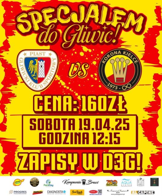 Wielka wyprawa pociągiem specjalnym do Gliwic w okresie świątecznym. Kibice Korony przygotowali coś wyjątkowego i z okazji świąt organizują pociąg specjalny na wyjazdowy mecz do Gliwic. Wyprawa odbędzie się w sobotę wielkanocną, a fani spodziewają się dużej frekwencji kieleckiej żółto-czerwonej armii. Zapisy na ten wyjątkowy przejazd ruszą już jutro w punkcie D3G-Fan Store – Sklep Kibica Korony Kielce dla wszystkich chętnych. Liczba miejsc w pociągu jest ściśle ograniczona, dlatego sympatycy proszeni są o szybkie zbieranie osiedlowych ekip. Całkowity koszt wyjazdu obejmujący przejazd pociągiem oraz bilet na mecz wynosi sto sześćdziesiąt złotych. Fani uważają, że wyjazd na mecz ukochanej drużyny jest rzeczą świętą, zwłaszcza w takim terminie. Wspólne podróżowanie pociągiem specjalnym zawsze buduje niesamowitą atmosferę i integruje całe środowisko kibicowskie. Kibice planują głośno wspierać swoją drużynę na stadionie Piasta i godnie zaprezentować kieleckie barwy. To doskonała okazja do spędzenia czasu w gronie fanatyków i wspólnej walki o ligowe punkty. Mobilizacja trwa, aby kielecki sektor gości wypełnił się po brzegi. Każdy wyjazd to nowa karta w historii kieleckiego ruchu kibicowskiego.