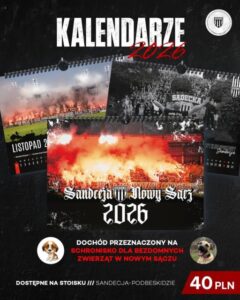 Podczas dzisiejszego meczu będzie można nabyć kalendarze 2026 rok, z których środki zostaną przeznaczone na pomoc schroniska dla bezdomnych zwierząt w Nowym Sączu. Serdecznie zapraszamy do udziału w tej charytatywnej inicjatywie.
