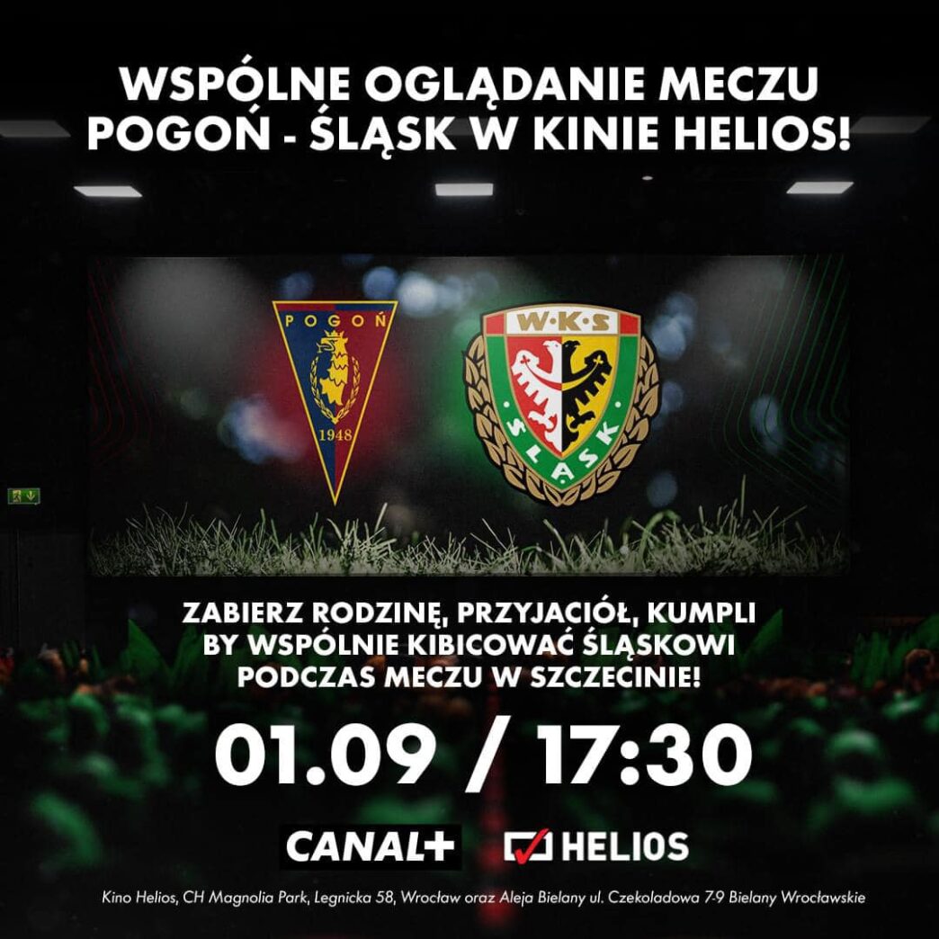 Zabierz rodzinę, przyjaciół i kumpli, by wspólnie kibicować Śląskowi podczas meczu w Szczecinie! 🍿Już jutro o 17:30 we wrocławskich Kino Helios Polska (Galeria Magnolia Park, ul. Legnicka 58 oraz CH Aleja Bielany, ul. Czekoladowa 7/9) będzie możliwość zobaczenia transmisji ze spotkania #POGŚLĄ z innymi fanami Śląska na sali kinowej! ✊To będzie też doskonała okazja do wygrania voucherów na mecz ze Stalą Mielec 🎫Wspólnie z partnerem wydarzenia – telewizją Canal + i siecią kin Helios…