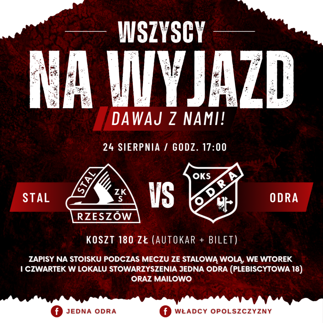 Już w sobotę Odra po raz kolejny zagra o ligowe punkty – tym razem wspierać dopingiem będziemy ją w Rzeszowie.Udamy się tam autokarem którego koszt wynosi 180zł.Zapisy prowadzone są:-od wtorku (20.08) do czwartku (22.08) w FanShop Odra Opole w godzinach pracy!-we wtorek (20.08) od 16:00 do 18:00 i czwartek (22.08) od 16:00 do 20:00 w ośrodku Kibice Razem Odra Opole na ul. Plebiscytowej 18-w środę (21.08) na stoisku z gadżetami przy okazji meczu ze Stalą Stalowa Wola-do czwartku (22.08) do…