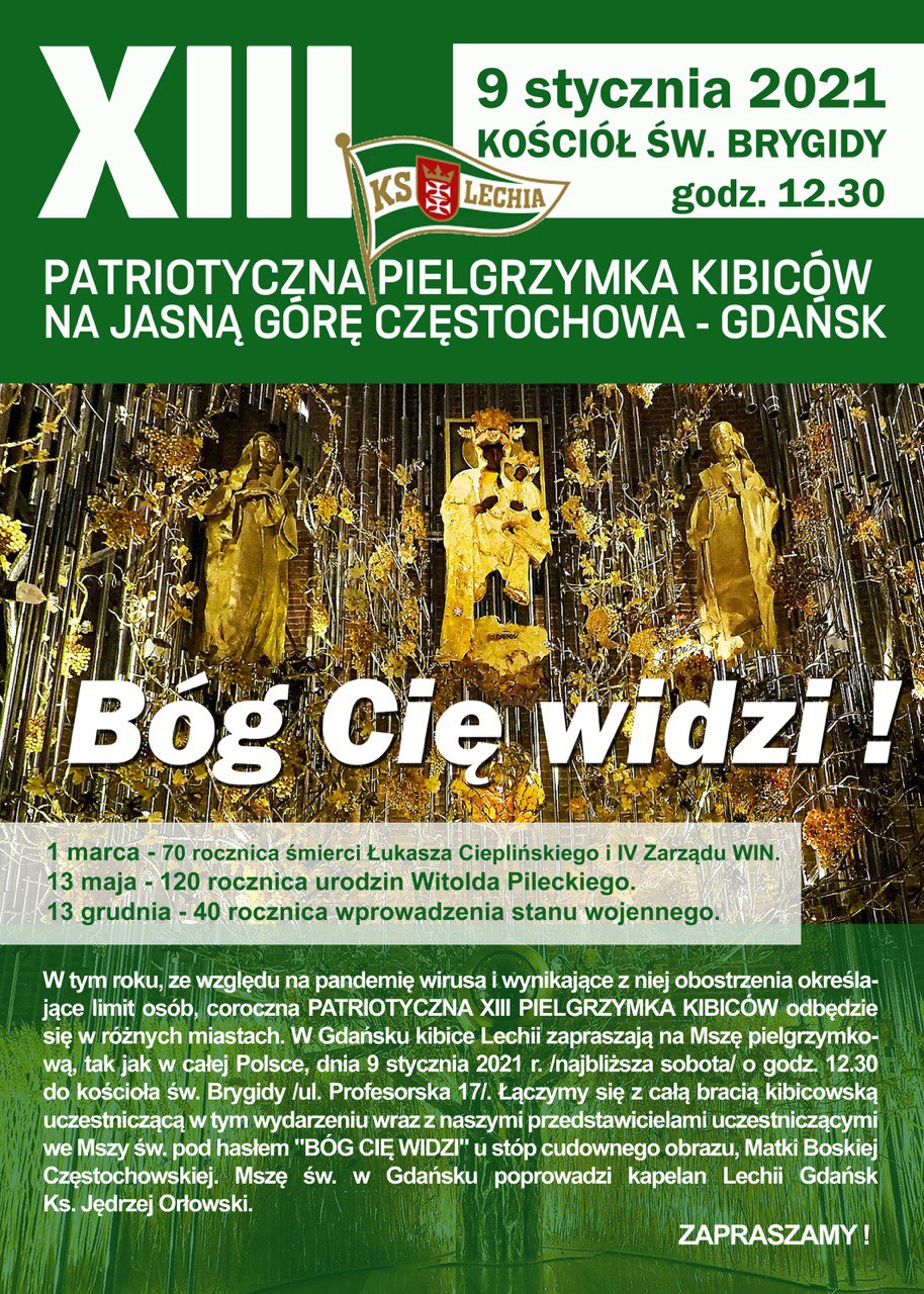 Patriotyczna XIII Pielgrzymka Kibiców z wiadomych względów w tym roku odbędzie się w tym samym czasie w różnych miastach. W Gdańsku kibice Lechii zapraszają na Mszę pielgrzymkową w najbliższą sobotę (09.01.2021) na godzinie 12:30 do kościoła Św. Brygidy (Ul. Profesorska 17).