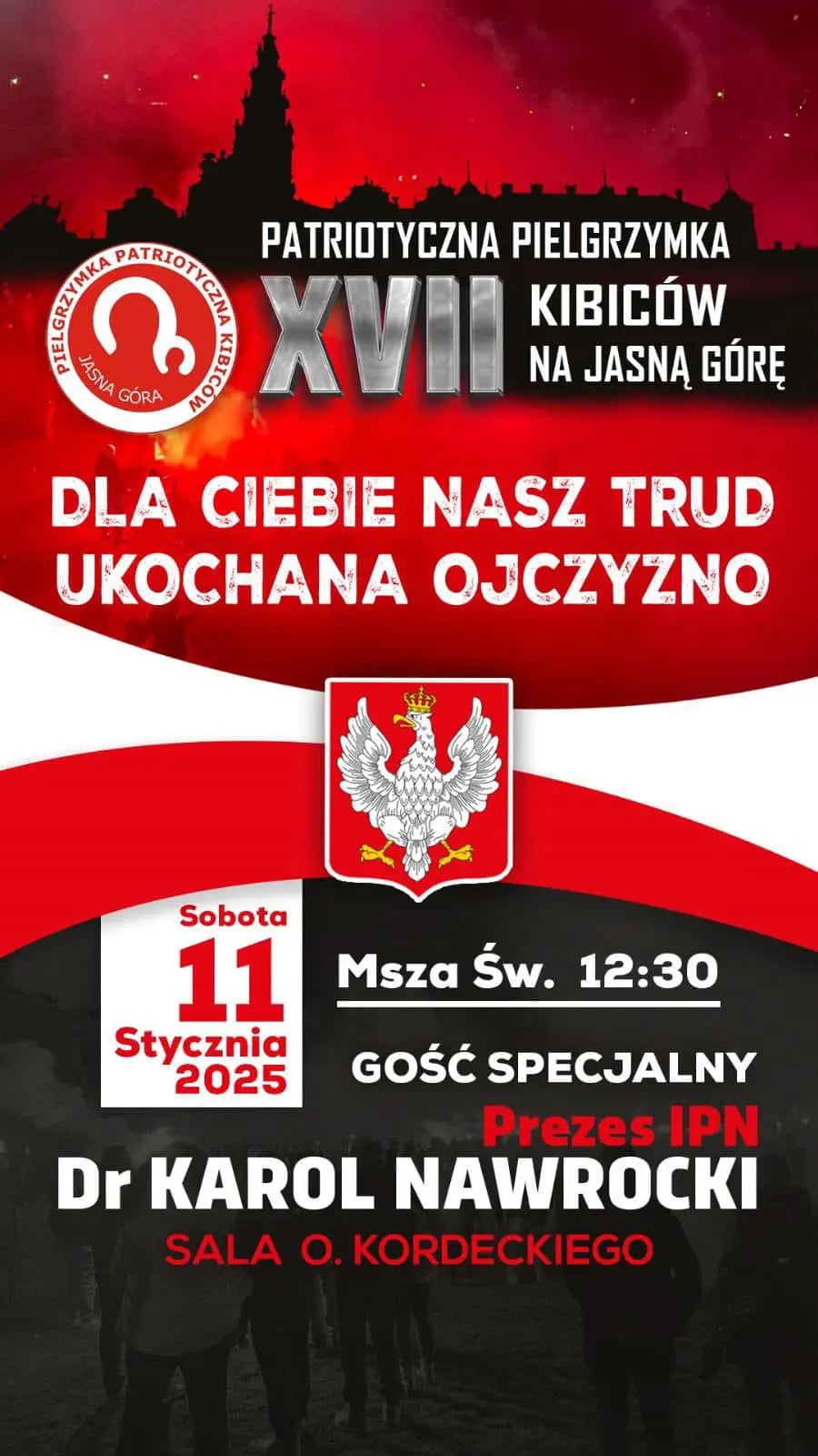 uż w sobotę, 11 stycznia 2025 roku, odbędzie się XVII Patriotyczna Pielgrzymka Kibiców na Jasną Górę. To wydarzenie, które co roku gromadzi tysiące kibiców z całej Polski, jest nie tylko wyrazem wiary, ale również okazją do podkreślenia naszej miłości do Ojczyzny. Tegoroczne hasło pielgrzymki –