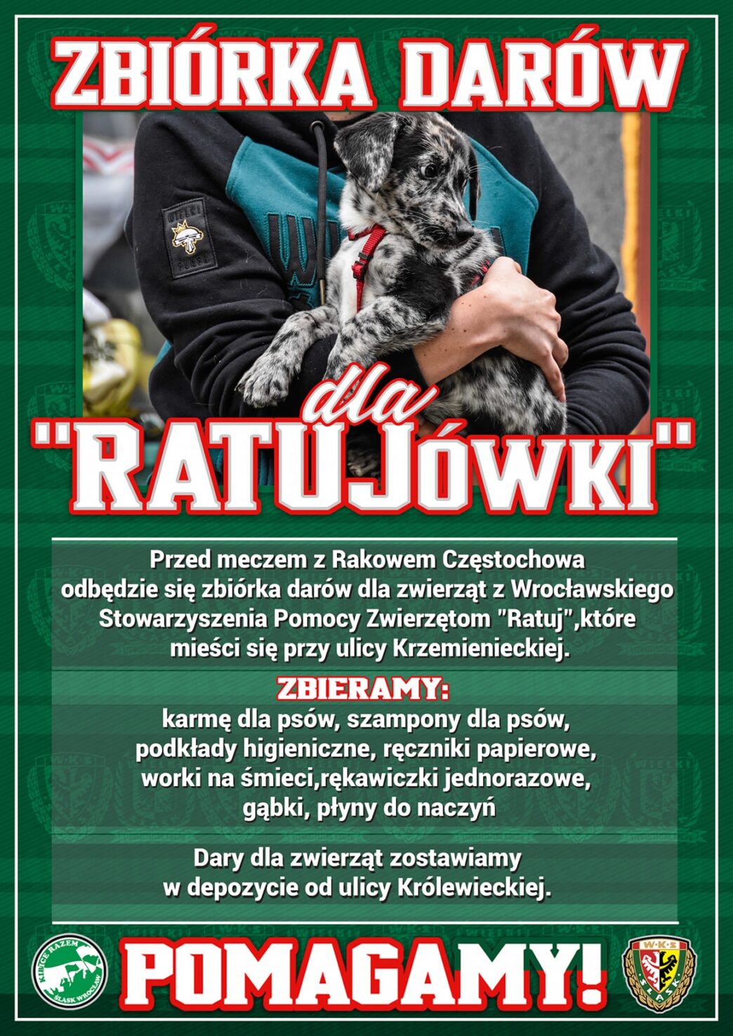 W najbliższy piątek wypada Międzynarodowy Dzień Psa. Z tej okazji przed meczem z Rakowem Częstochowa odbędzie się zbiórka darów dla zwierząt z Wrocławskiego Stowarzyszenia Pomocy Zwierzętom „Ratuj”, które mieści się przy ulicy Krzemienieckiej.